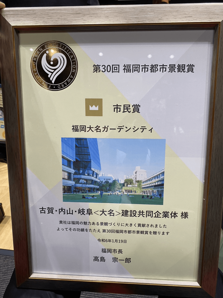 福岡大名ガーデンシティ | 受賞作品紹介【福岡市都市景観賞|福岡のまちもひとも トットコ】 (fukuoka.lg.jp)このような素敵な賞をいただき心より感謝申し上げます。