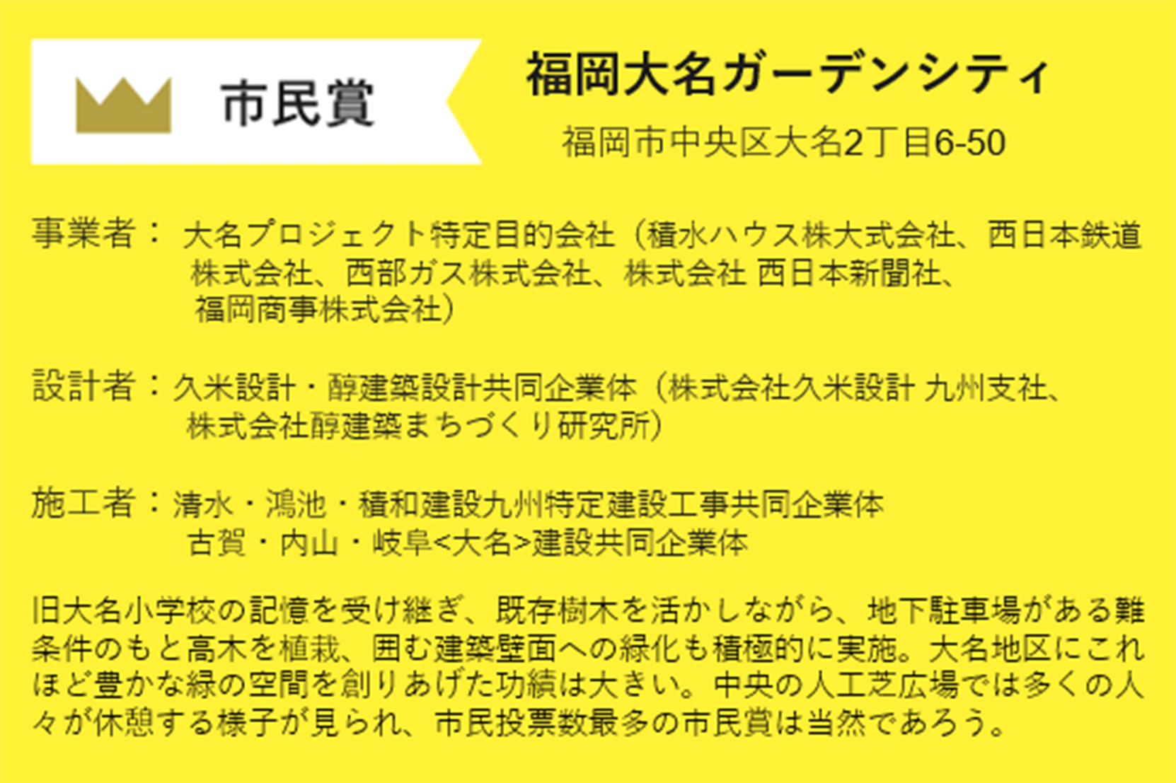 弊社が携わらせていただいた福岡大名ガーデンシティが市民賞を受賞いたしました。